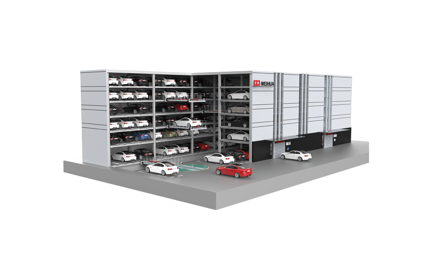該類停車設(shè)備采用與立體倉(cāng)庫(kù)類似的原理和結(jié)構(gòu),空間利用率高。采用封閉式結(jié)構(gòu),無(wú)需出車道或搬運(yùn)通道,利用車位間移動(dòng)旋轉(zhuǎn)再由升降機(jī)配合實(shí)現(xiàn)出車。該系統(tǒng)可在升降機(jī)和停車層面任意